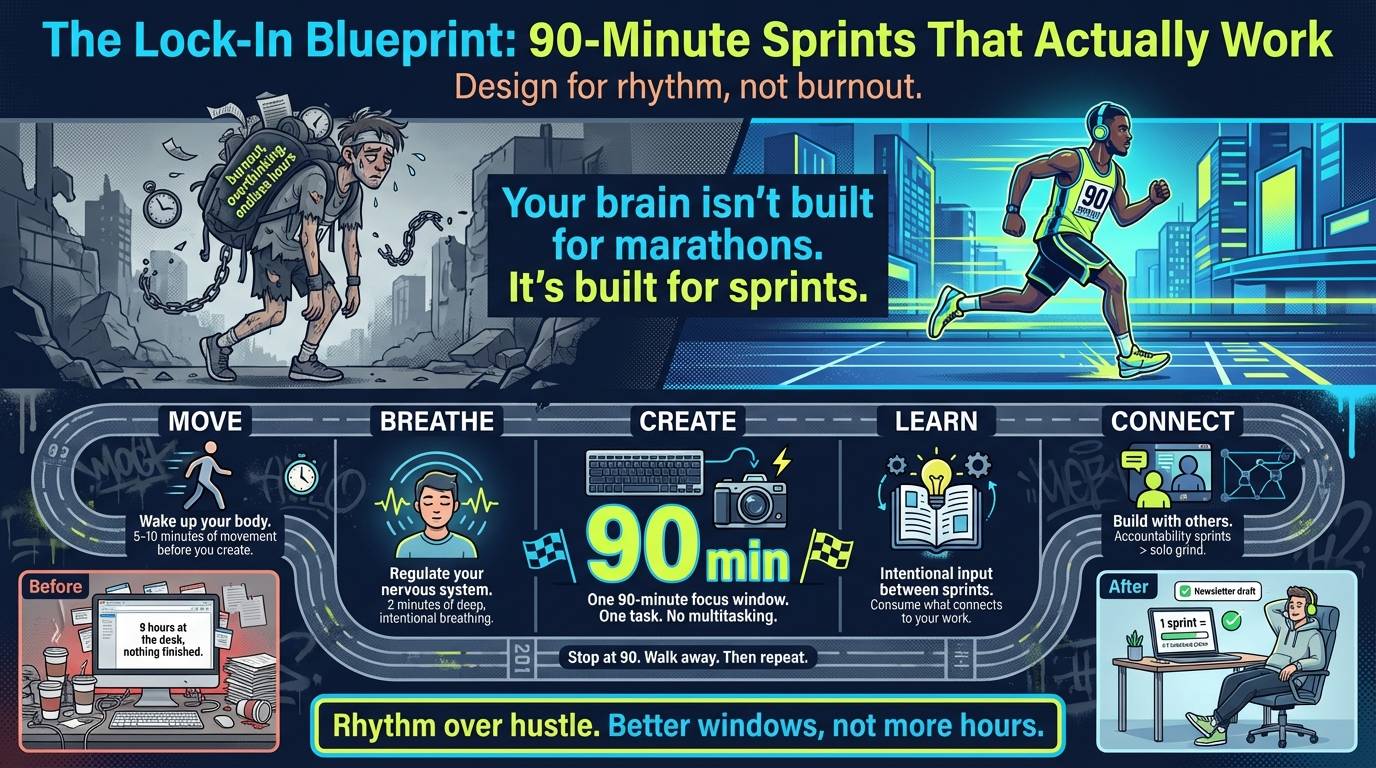 Here's what I need you to try this week: one 90-minute sprint. Timer on. Phone off. One deliverable.