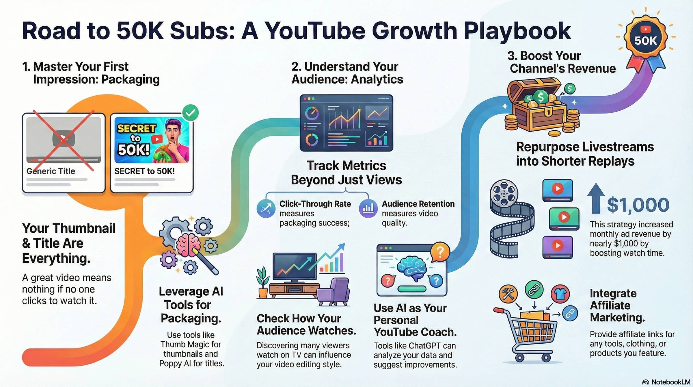 - Action: Every week export analytics, run it through an AI , and get 3 prioritized suggestions (change thumbnail, shorten hook, add chapter).