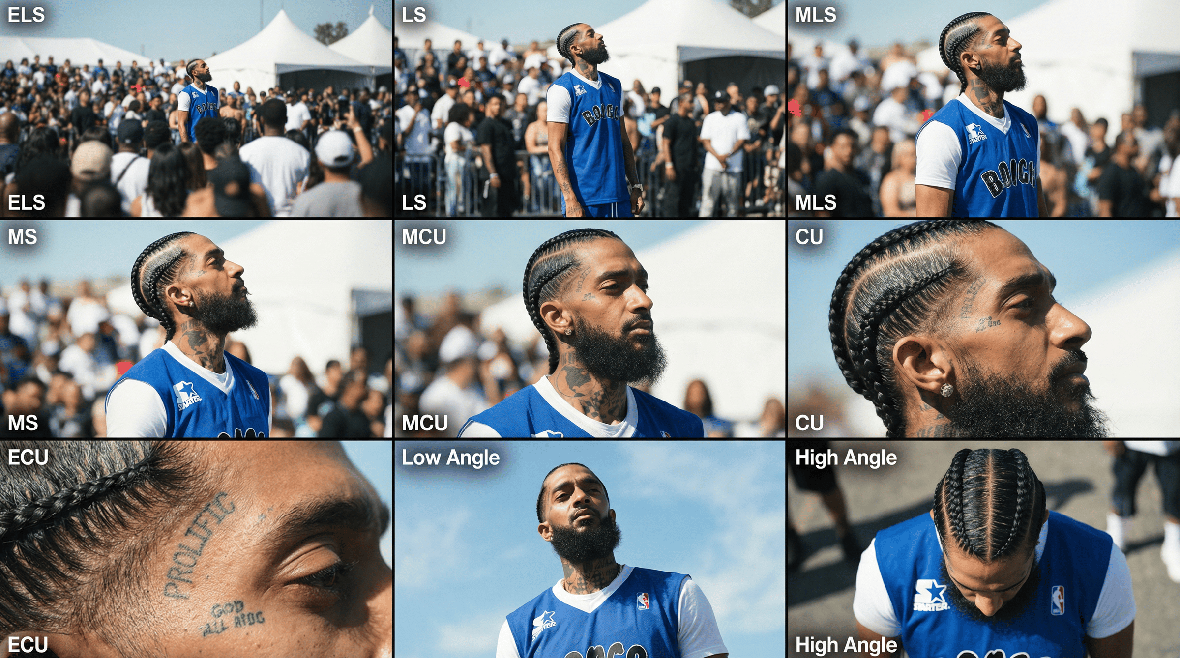 *Top Row: ** Wide environmental shot, Full view, 3/4 cut. *Middle Row:** Waist-up view, Chest-up view, Face/Front close-up. *Bottom Row: ** Macro detail, Low Angle, High Angle.
