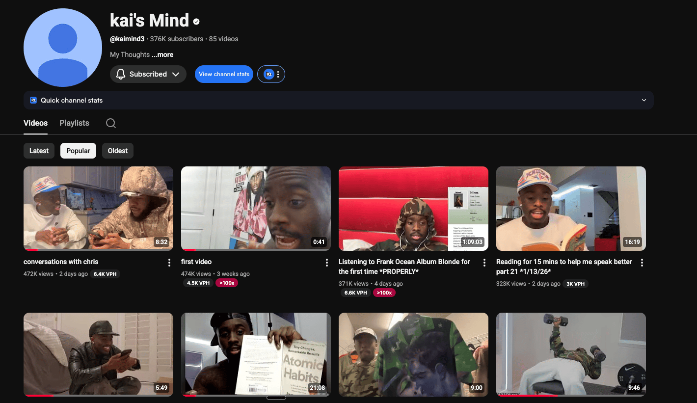 In the beginning? Those videos got 10 views. 50 views. 100 views max. He didn't do what he normally does. No optimized thumbnails. No title strategy. Just being himself.
